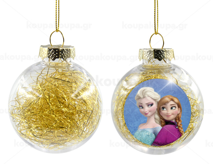 Ψυχρά κι ανάποδα Έλσα και Άννα, Transparent Christmas tree ball ornament with gold filling 8cm