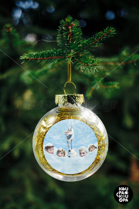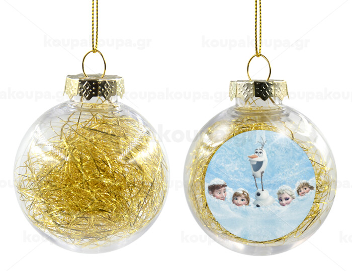 Ψυχρά κι ανάποδα Όλαφ και οι φίλοι του, Transparent Christmas tree ball ornament with gold filling 8cm