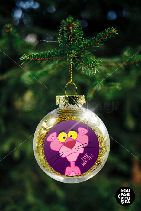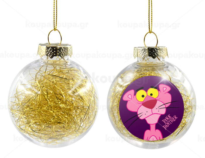Pink Panther cartoon, Transparent Christmas tree ball ornament with gold filling 8cm