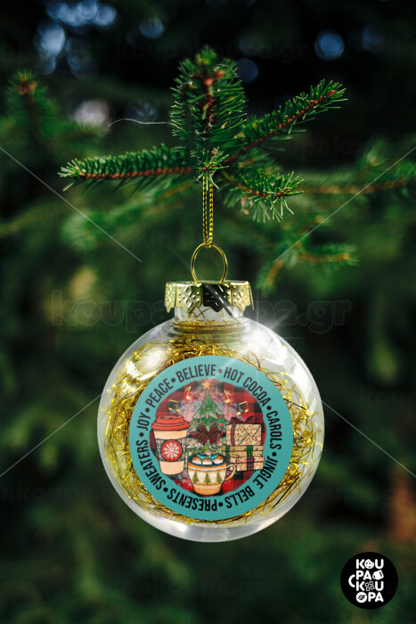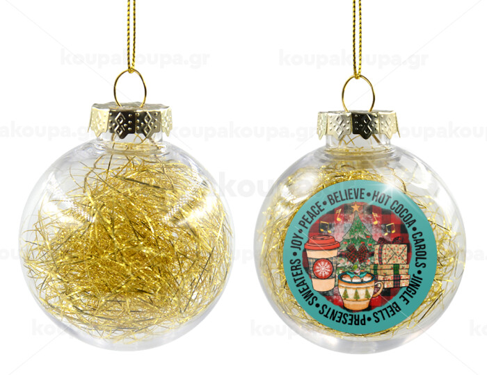 Joy, Peace, Believe, Hot Cocoa, Carols, Transparent Christmas tree ball ornament with gold filling 8cm