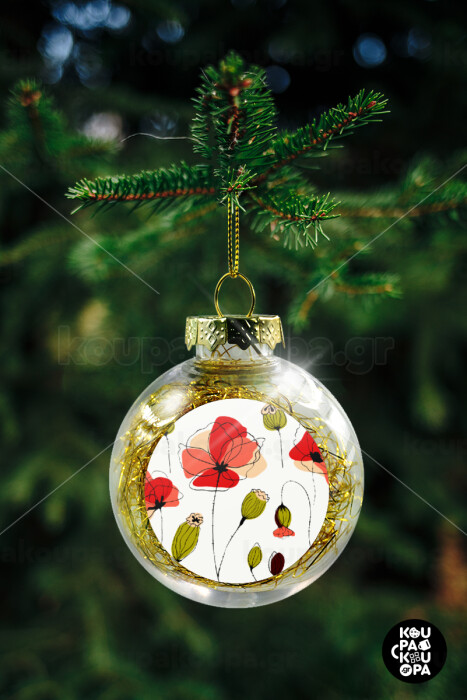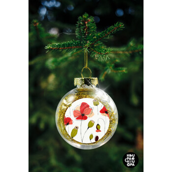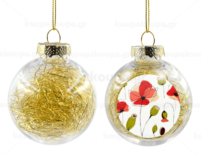 Red poppy flowers papaver, Transparent Christmas tree ball ornament with gold filling 8cm