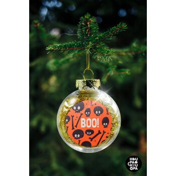 Halloween boo, Transparent Christmas tree ball ornament with gold filling 8cm