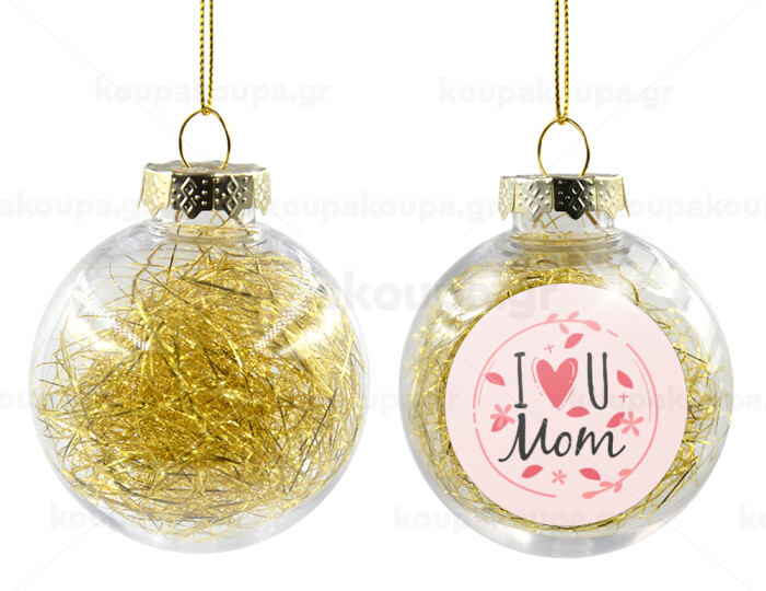 I Love you Mom pink, Transparent Christmas tree ball ornament with gold filling 8cm
