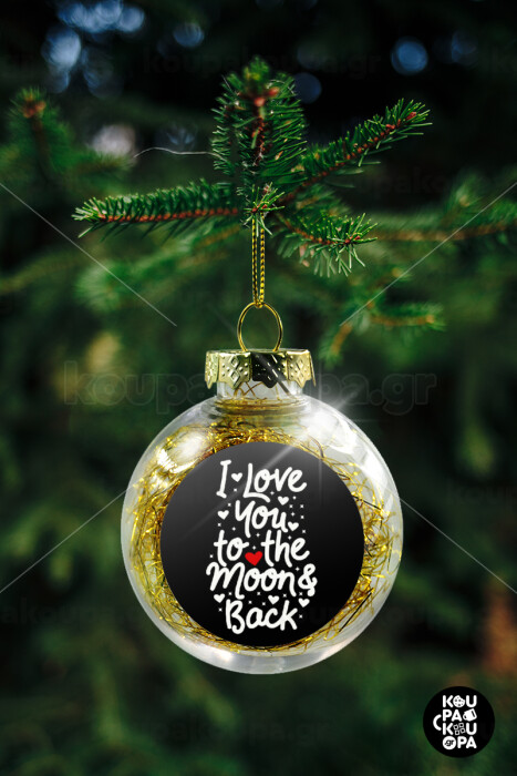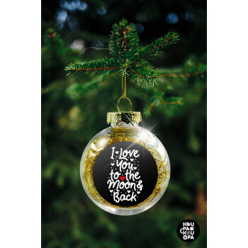 I love you to the moon and back with hearts, Transparent Christmas tree ball ornament with gold filling 8cm