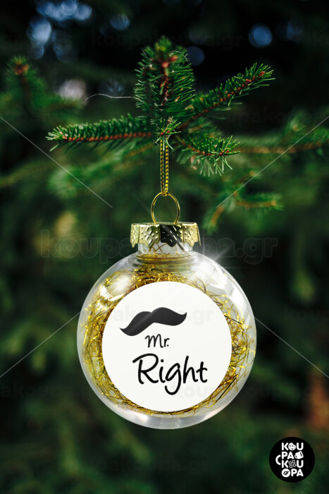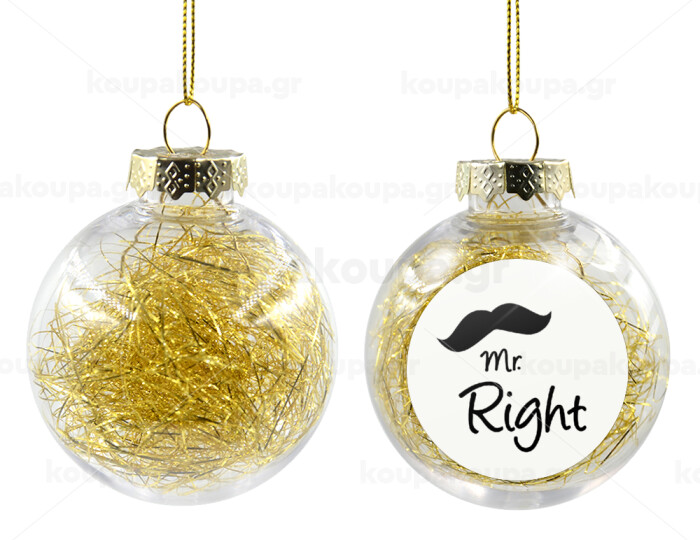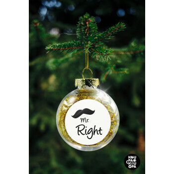 Mr right Mustache, Transparent Christmas tree ball ornament with gold filling 8cm