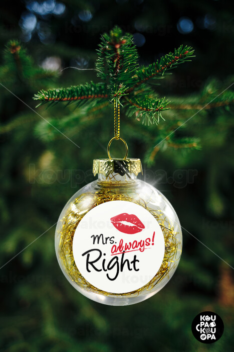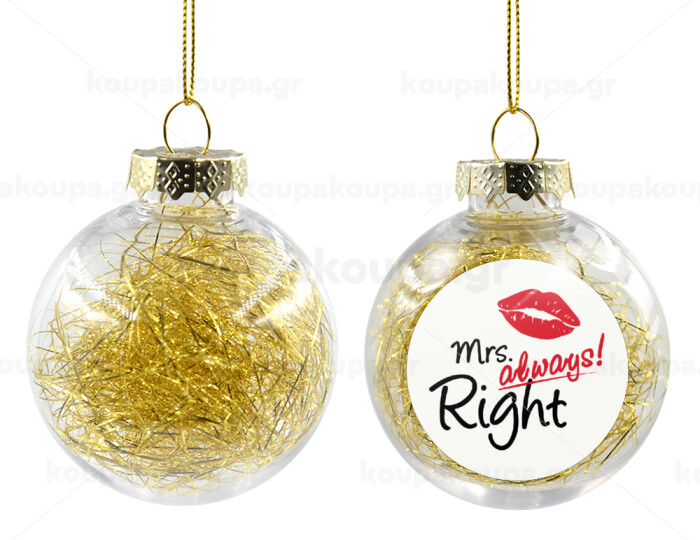 Mrs always right kiss, Transparent Christmas tree ball ornament with gold filling 8cm