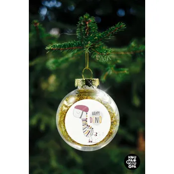 Happy Dino, Transparent Christmas tree ball ornament with gold filling 8cm