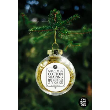 Mr & Mrs Sharing the sofa, Transparent Christmas tree ball ornament with gold filling 8cm