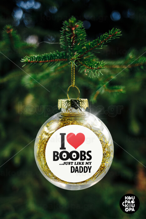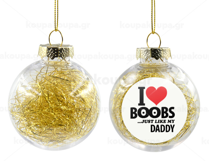 I Love boobs ...just like my daddy, Transparent Christmas tree ball ornament with gold filling 8cm