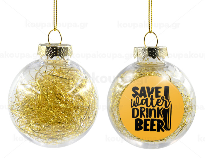 Save Water, Drink BEER, Transparent Christmas tree ball ornament with gold filling 8cm