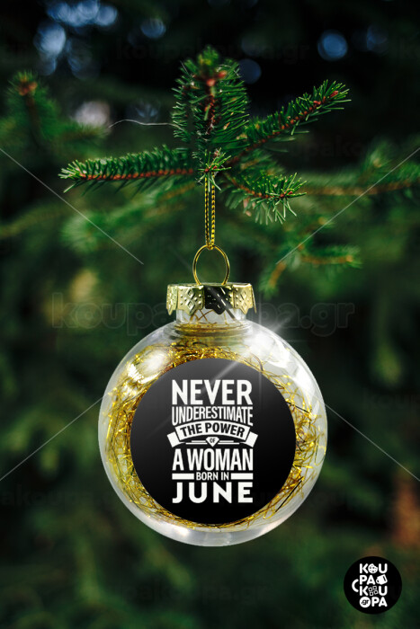Never Underestimate the poer of a Woman born in..., Transparent Christmas tree ball ornament with gold filling 8cm