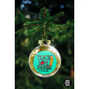 Teach, Love, Inspire, Transparent Christmas tree ball ornament with gold filling 8cm