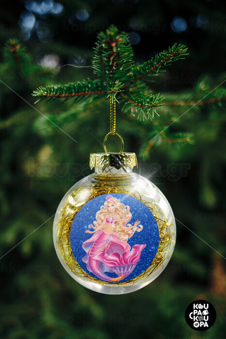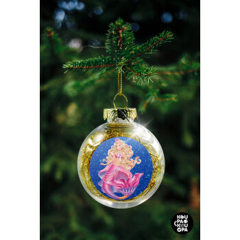 Barbie mermaid blue, Transparent Christmas tree ball ornament with gold filling 8cm