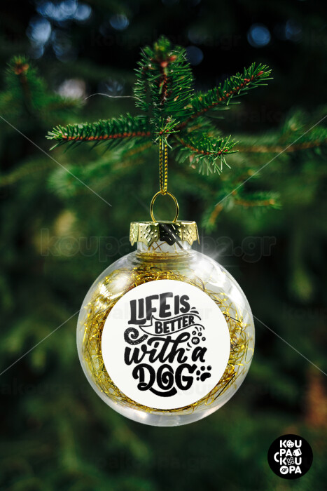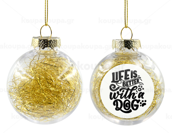 Life is better with a DOG, Transparent Christmas tree ball ornament with gold filling 8cm