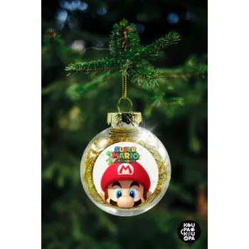 Super mario head, Transparent Christmas tree ball ornament with gold filling 8cm