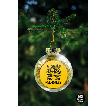 A smile is the prettiest thing you can wear, Transparent Christmas tree ball ornament with gold filling 8cm
