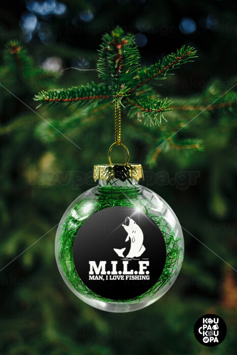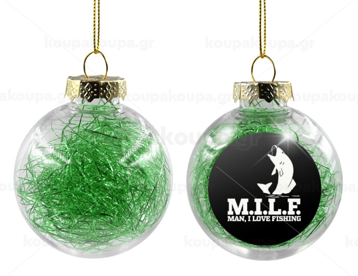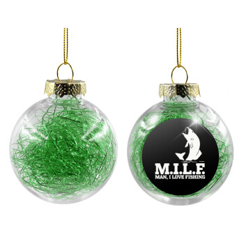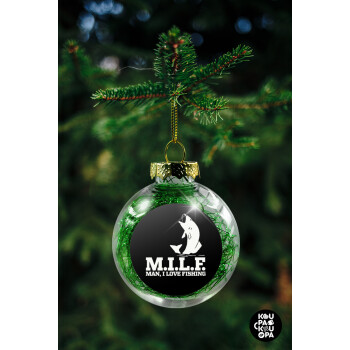 M.I.L.F. Mam i love fishing, Transparent Christmas tree ball ornament with green filling 8cm