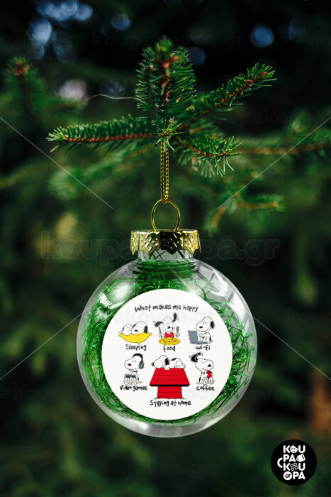 Snoopy what makes my happy, Transparent Christmas tree ball ornament with green filling 8cm