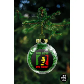 Bob marley, one love, Transparent Christmas tree ball ornament with green filling 8cm