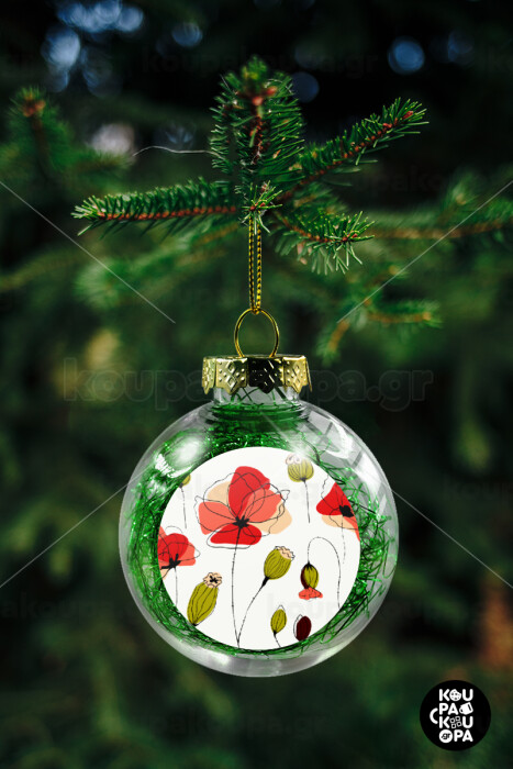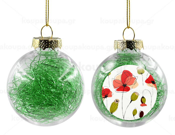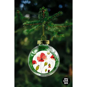 Red poppy flowers papaver, Transparent Christmas tree ball ornament with green filling 8cm