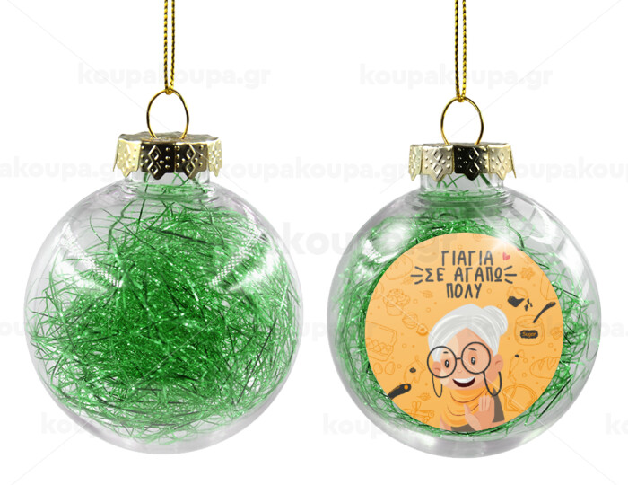 Γιαγιά σε αγαπώ πολύ!, Transparent Christmas tree ball ornament with green filling 8cm