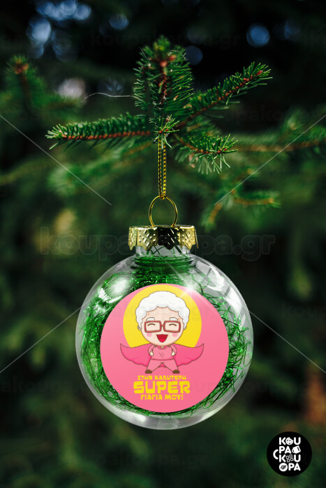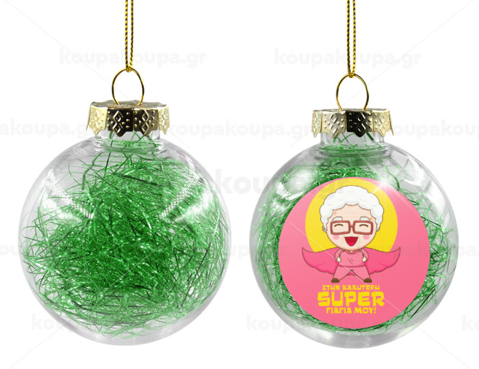 To my best Super Grandma!, Transparent Christmas tree ball ornament with green filling 8cm