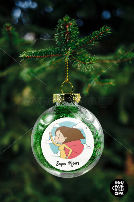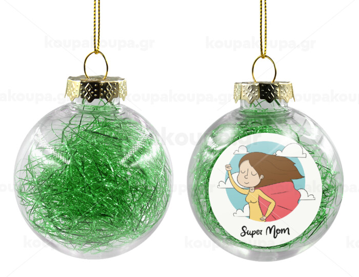 Super mom, Transparent Christmas tree ball ornament with green filling 8cm