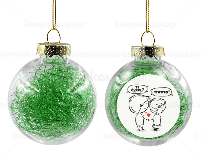 Τι έχεις? Τίποτα!, Transparent Christmas tree ball ornament with green filling 8cm