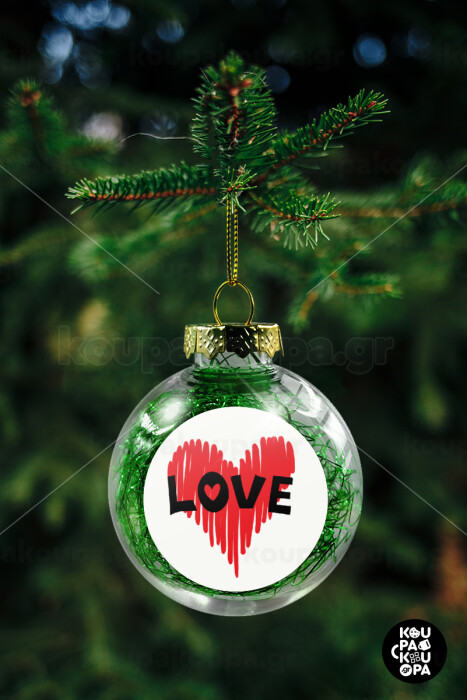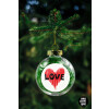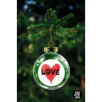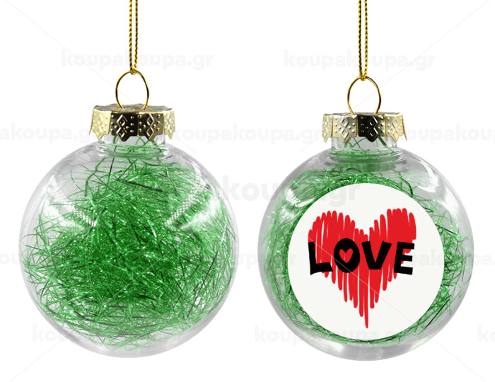 I Love You red heart, Transparent Christmas tree ball ornament with green filling 8cm
