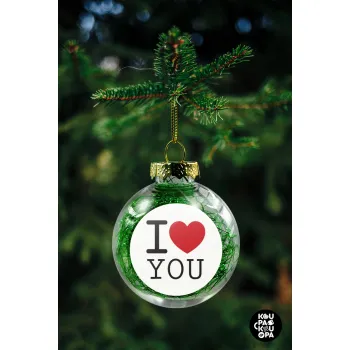 I Love you classic, Transparent Christmas tree ball ornament with green filling 8cm