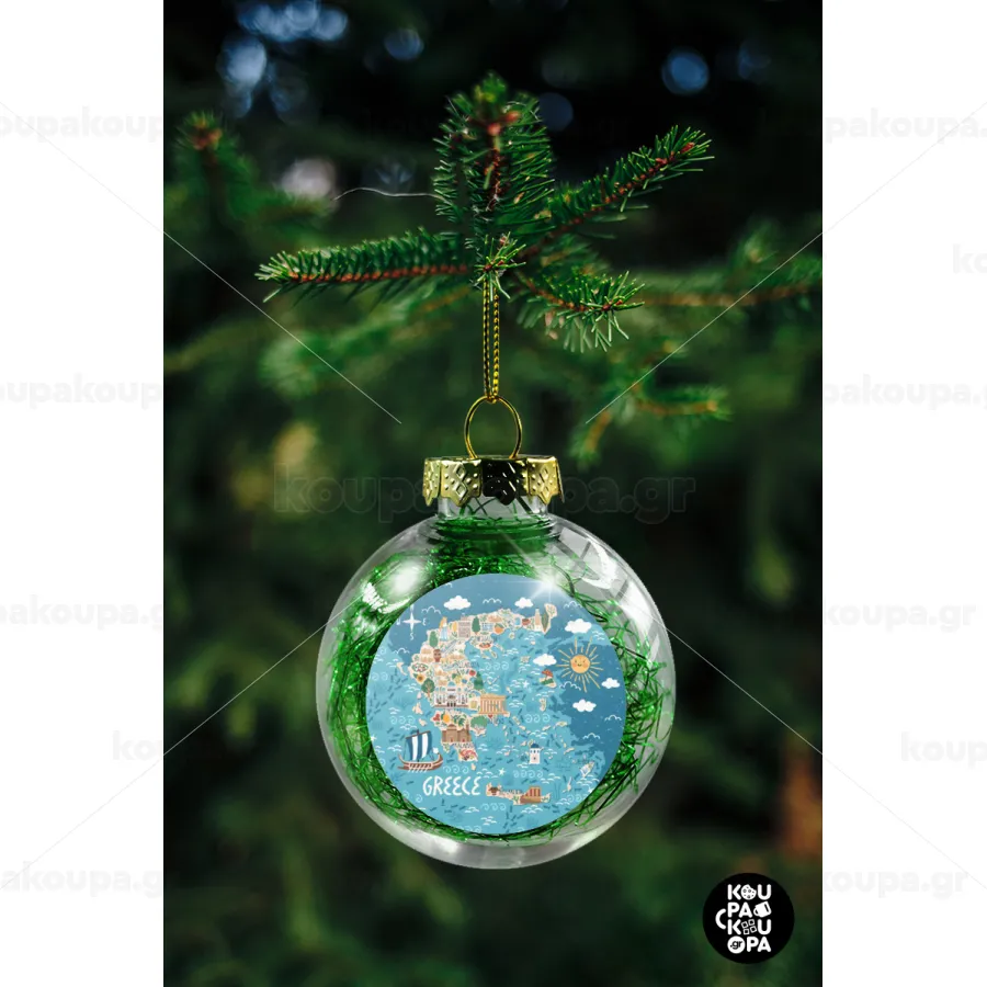 Greek map, Transparent Christmas tree ball ornament with green filling 8cm
