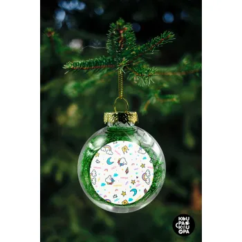 Unicorn pattern white, Transparent Christmas tree ball ornament with green filling 8cm
