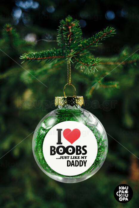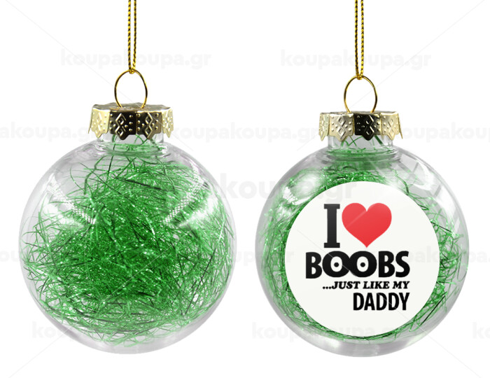 I Love boobs ...just like my daddy, Transparent Christmas tree ball ornament with green filling 8cm