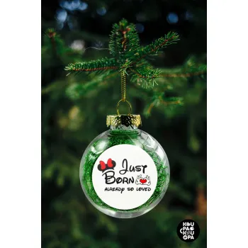Just born already so loved, Transparent Christmas tree ball ornament with green filling 8cm