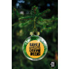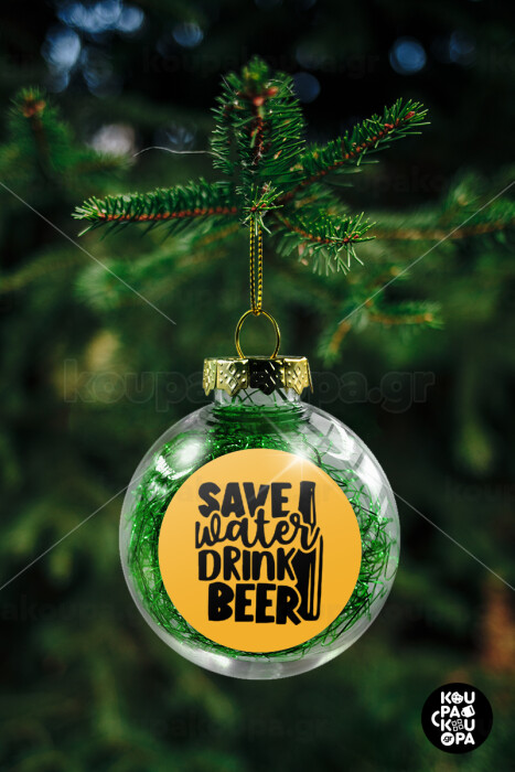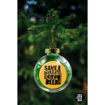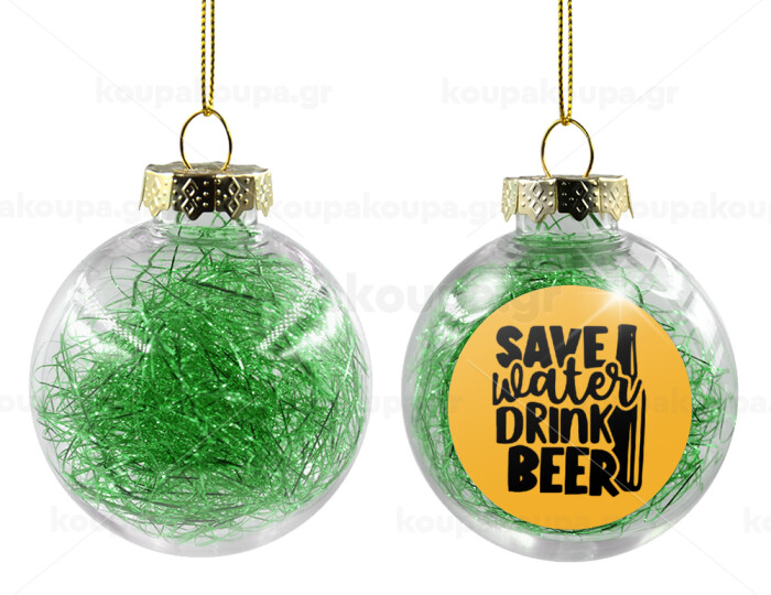 Save Water, Drink BEER, Transparent Christmas tree ball ornament with green filling 8cm
