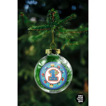 Happy 1st Birthday, Transparent Christmas tree ball ornament with green filling 8cm