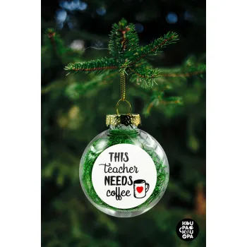 Τhis teacher needs coffee, Transparent Christmas tree ball ornament with green filling 8cm