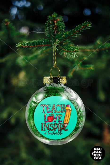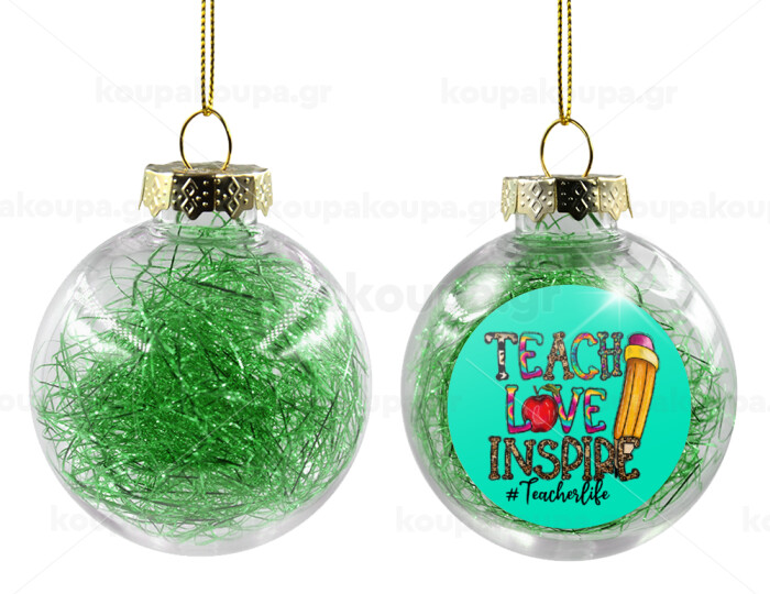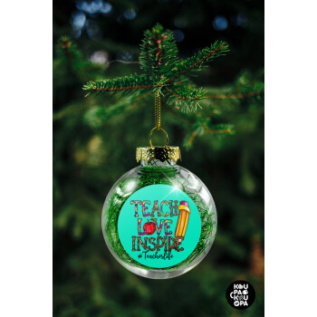 Teach, Love, Inspire, Transparent Christmas tree ball ornament with green filling 8cm