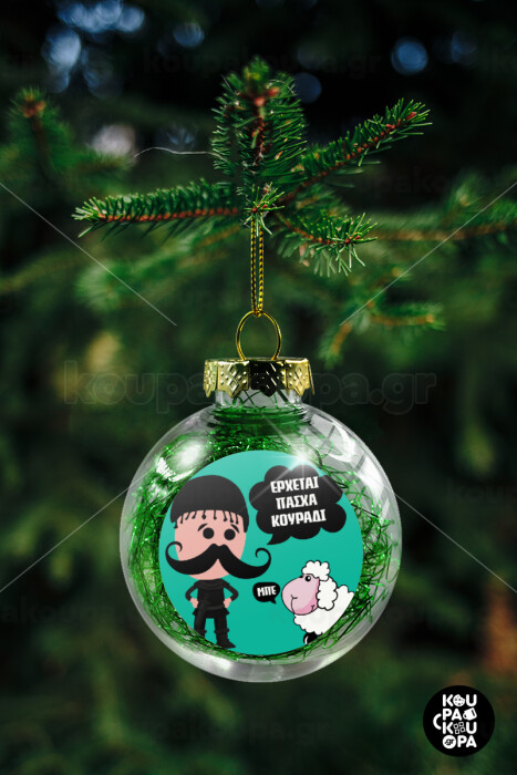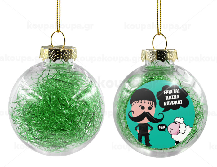 Κρητικός "Έρχεται Πάσχα κουράδι", Transparent Christmas tree ball ornament with green filling 8cm