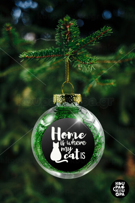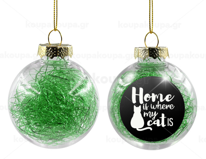 Home is where my cat is!, Transparent Christmas tree ball ornament with green filling 8cm