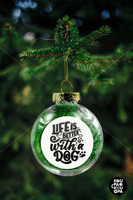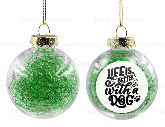 Life is better with a DOG, Transparent Christmas tree ball ornament with green filling 8cm