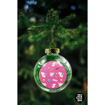 Χριστουγεννιάτικο διακοσμητικό στολίδι διάφανο με μεταλιζέ angel hair εσωτερικά σε μέγεθος 8cm, ελαφρύ σε μέγεθος για να μην κρεμάει το κλαδάκι, με κορδόνι στήριξης για τα κλαδάκια.