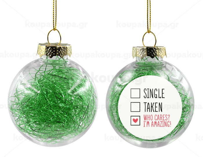 Single, Taken, Who cares i'm amazing, Transparent Christmas tree ball ornament with green filling 8cm