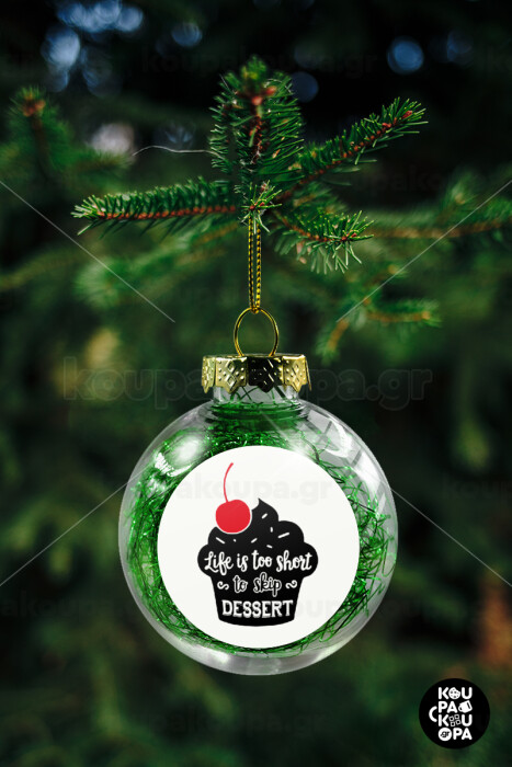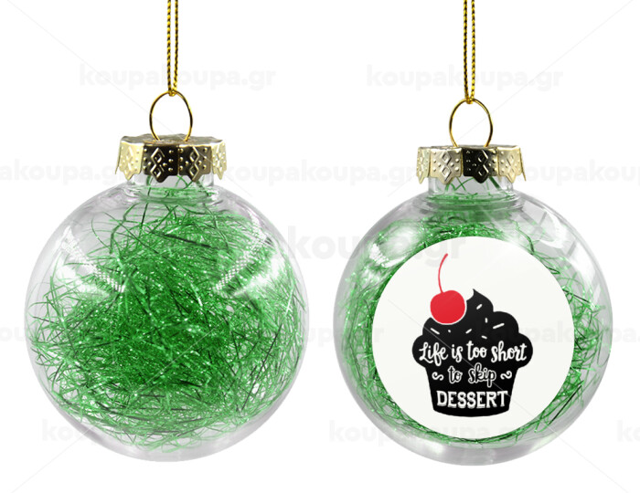Life is too short, to skip Dessert, Transparent Christmas tree ball ornament with green filling 8cm