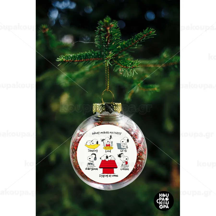 Snoopy what makes my happy, Transparent Christmas tree ball ornament with red filling 8cm
