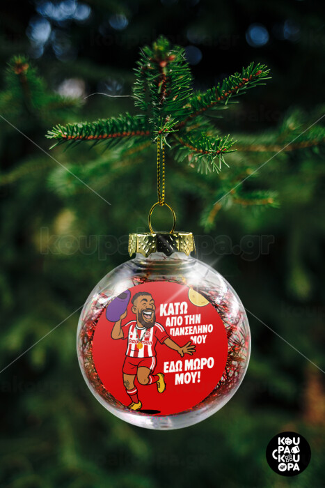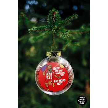 Ροντινέι, "ΚΑΤΩ ΑΠΟ ΤΗΝ ΠΑΝΣΕΛΗΝΟ ΜΟΥ!", Transparent Christmas tree ball ornament with red filling 8cm