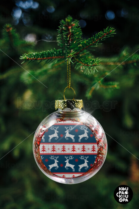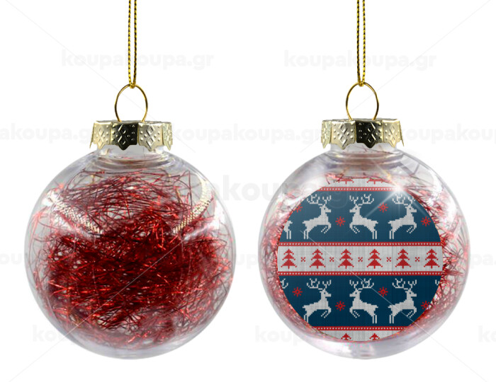 Deer knitted blue, Transparent Christmas tree ball ornament with red filling 8cm
