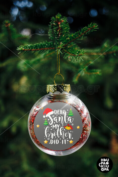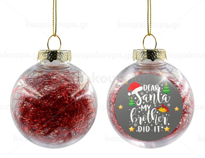Dear santa my Brother did it, Transparent Christmas tree ball ornament with red filling 8cm