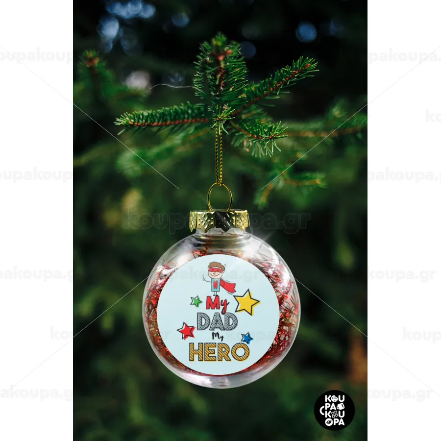 My Dad, my Hero!!!, Transparent Christmas tree ball ornament with red filling 8cm