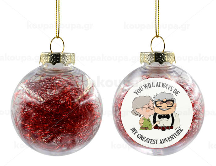 UP, YOU WILL ALWAYS BE MY GREATEST ADVENTURE, Transparent Christmas tree ball ornament with red filling 8cm